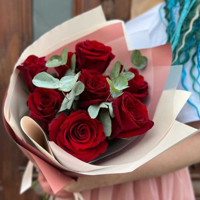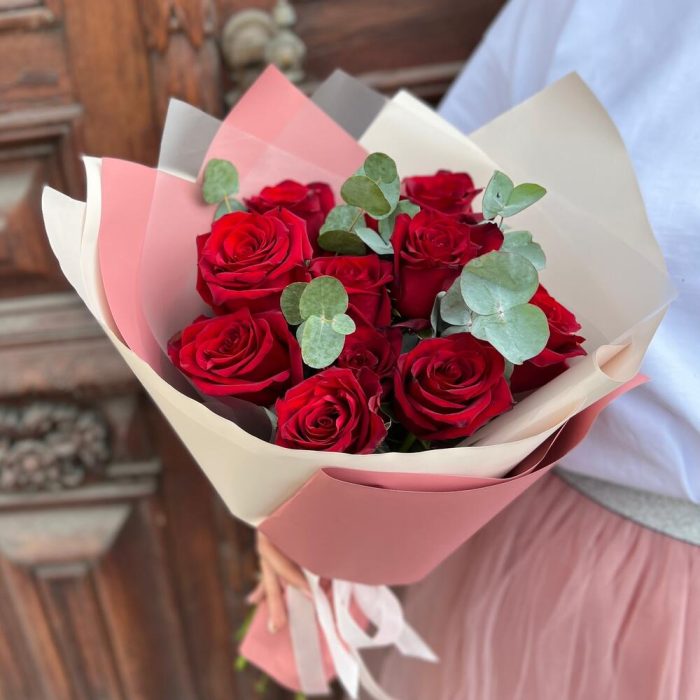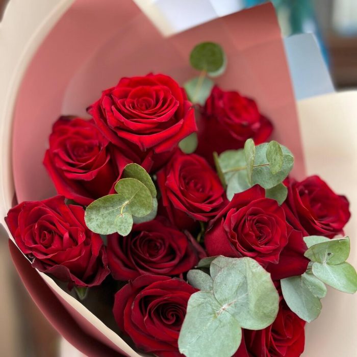 Эвкалипт – 3 шт.Лента атласная – 1 шт.Роза Эксплорер – 11 шт.Пленка дизайнерская – 2 шт.