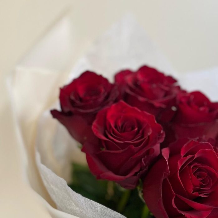 Упаковка с атласной лентой – 5 шт.Тишью белое – 2 шт.роза эквадор эксплорер премиум – 5 шт.