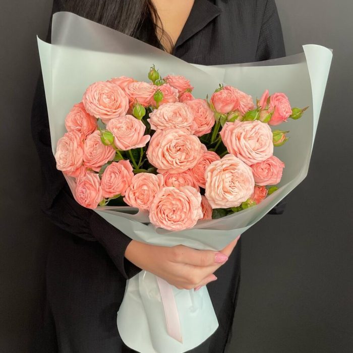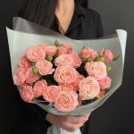 Лента атласная – 1 шт.Пленка матовая – 6 шт.кустовая пионовидная роза мадам бомбастик – 7 шт.
