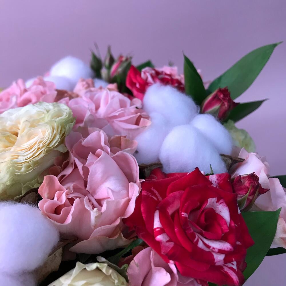 роза кустовая кружевная – 5 шт.Хлопок – 3 шт.Лента атласная – 1 шт.Тишью – 1 шт.Шляпная коробка – 1 шт.Оазис флористический – 1 шт.макарон (пирожное) – 4 шт.Рускус – 3 шт.