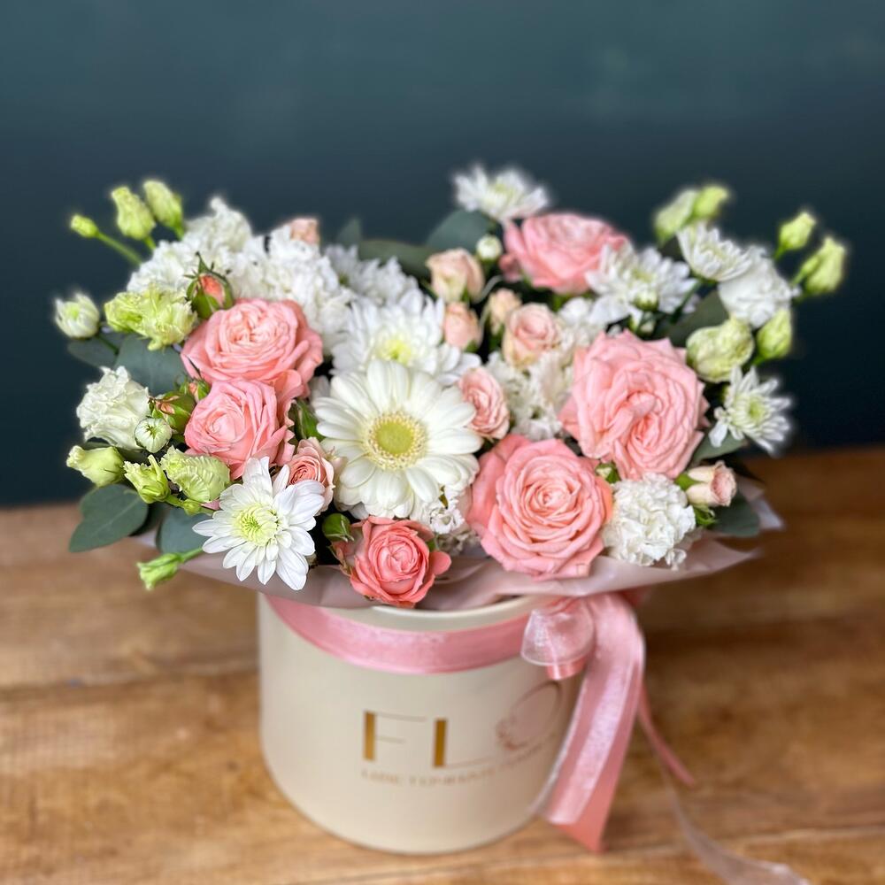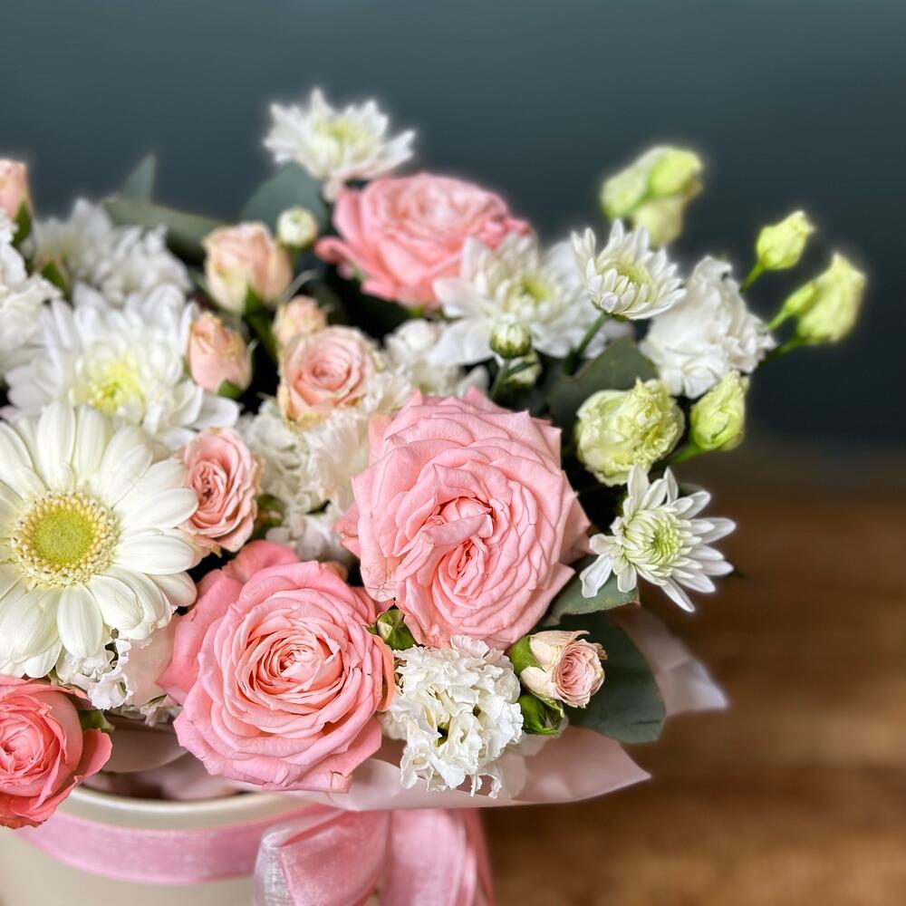 Лента – 2 шт.Гербера мини – 1 шт.Роза кустовая Голландия – 1 шт.Шляпная коробка – 1 шт.Эвкалипт цинерария – 1 шт.роза кустовая мадам бомбастик – 1 шт.мохровая хризантема кустовая – 1 шт.лизиантус мохровой (эустома) – 1 шт.