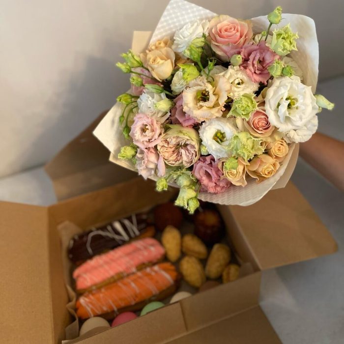 Упаковка – 1 шт.Лента атласная – 1 шт.Упаковка дизайнерская – 1 шт.крафтовая коробка – 1 шт.розы кустовые – 5 шт.розы одноголовые – 5 шт.лизтантус – 6 шт.поздравительная открытка – 1 шт.сладости микс по согласованию с клиентом – 10 шт.Открытка мини – 1 шт.