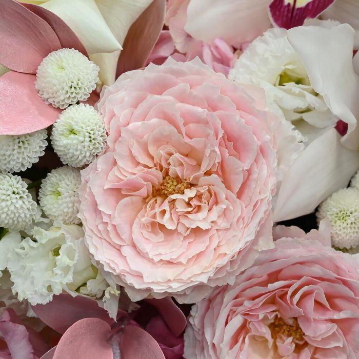 Пионовидная кустовая роза – 4 шт.Французская роза – 6 шт.Эустома – 6 шт.Рускус – 6 шт.Хризантема одноголовая – 2 шт.Гортензия – 1 шт.Гвоздика – 7 шт.Сантини – 4 шт.Нерина – 2 шт.ЦИМБИДИУМ – 5 шт.Пионовидная роза – 3 шт.Магнолия – 2 шт.Аралия – 1 шт.Упаковка дизайнерская – 2 шт.