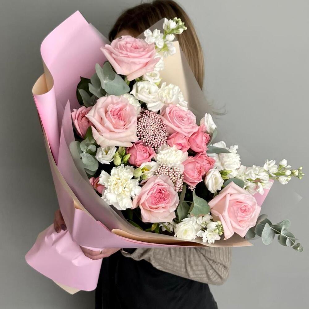 Роза Эквадор – 5 шт.Маттиола – 3 шт.Роза пионовидная кустовая – 2 шт.Лизиантус – 1 шт.Озотамнус – 2 шт.Диантус – 3 шт.Эвкалипт – 2 шт.Упаковка дизайнерская – 3 шт.