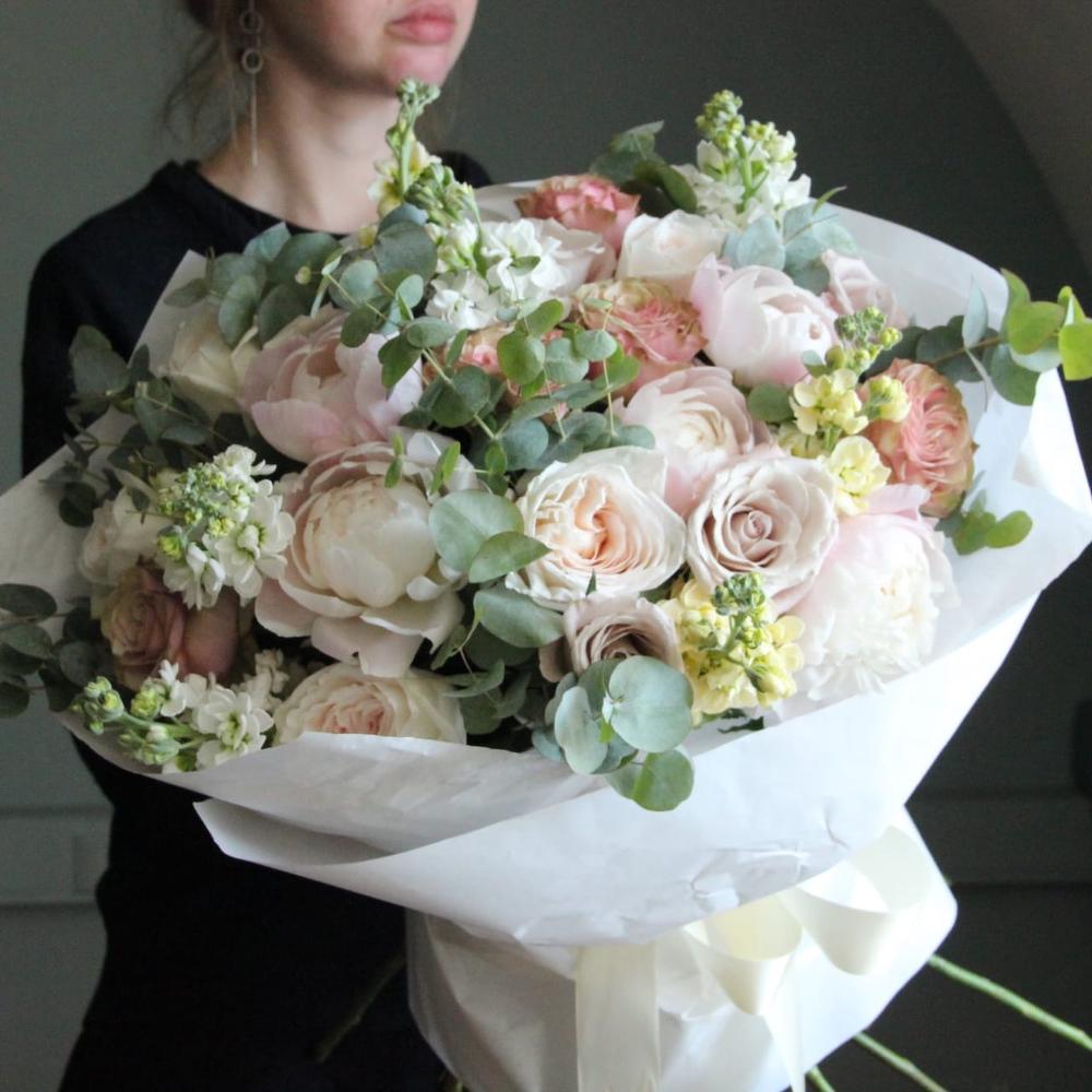Роза пионовидная – 7 шт.Роза сортовая – 7 шт.Маттиола – 7 шт.Пион – 5 шт.Эвкалипт – 9 шт.Упаковка – 1 шт.
