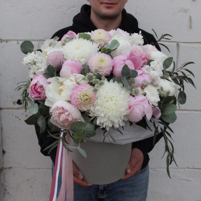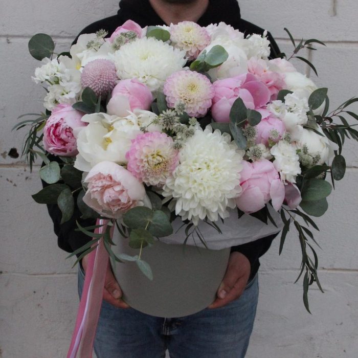 Пионовидная роза – 11 шт.Маттиола – 9 шт.Хризантема сортовая – 5 шт.Астранция – 4 шт.Эвкалипт – 15 шт.Гвоздика – 7 шт.Тишью – 2 шт.Шляпная коробка – 1 шт.Оазис флористический – 1 шт.Лента атласная – 2 шт.Пион – 7 шт.