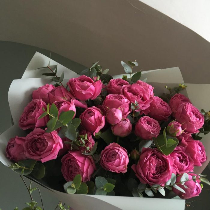 Букет из девяти кустовых пионовидных роз с веточками эвкалипта в лаконичной упаковке.Стильное цветочное решение для любого случая.Ширина букета около 50 сантиметров, высота букета около 60 сантиметров.
