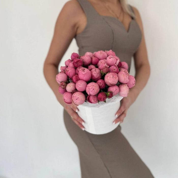 Пиафлор (оазис) – 2 шт.Шляпная коробка – 1 шт.Пионовидная кустовая роза – 5 шт.