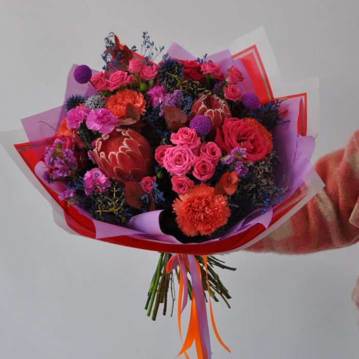 Очень яркий!Необычное сочетание экзотики и классики – протея, колючки, розы и гвоздики.Необычный букет для вашего получателя!Станет прекрасным подарком на день рождения, юбилей. Яркие краски как никогда лучше подходят для дарения в это время года)