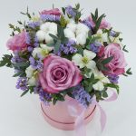 Розы, альстромерии и гипсофила в шляпной коробке