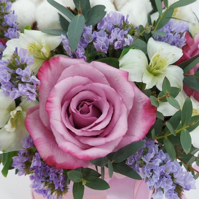 Роза одноголовая – 5 шт.Альстромерия – 3 шт.Хлопок натуральный – 2 шт.Статица лавандовая – 3 шт.Эвкалипт – 4 шт.Коробка цилиндр – 1 шт.Пленка матовая – 1 шт.Лента атласная – 1 шт.Флористическая губка (оазис) – 1 шт.