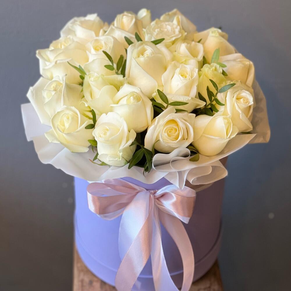 розы белые – 25 шт.Оазис флористический – 2 шт.Шляпная коробка – 1 шт.Пленка матовая – 1 шт.Лента атласная – 2 шт.работа флориста – 1 шт.