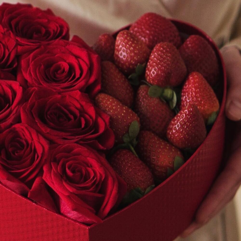 Шляпная коробка – 1 шт.Роза – 7 шт.Клубника – 300 гр.