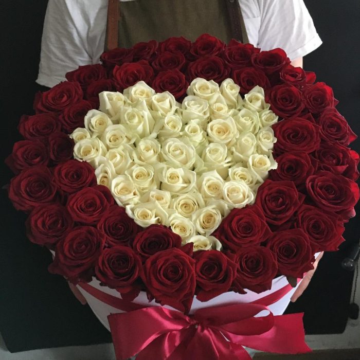 Роза red naomi – 70 шт.Роза Аваланж – 31 шт.Коробка шляпная – 1 шт.Оазис флористический – 5 шт.Лента атласная – 3 шт.