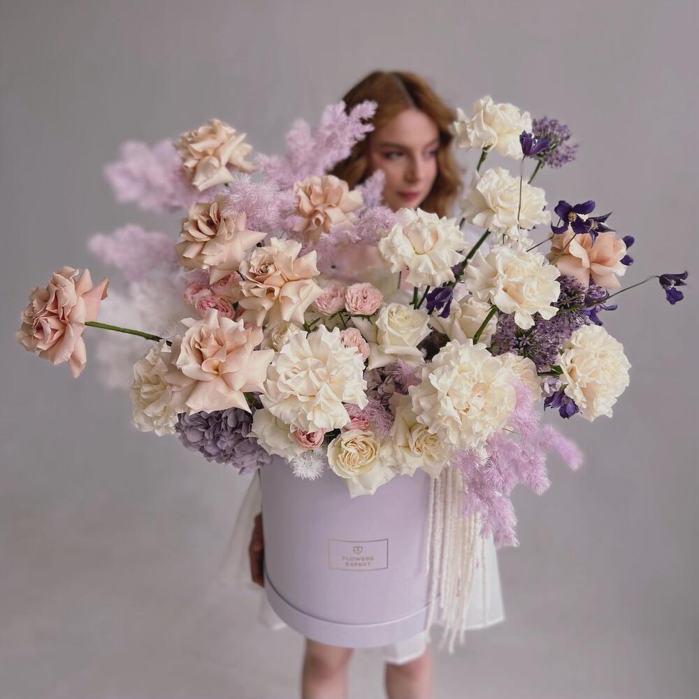 Шляпная коробкаБольшая пышная коробка с цветамиГортензииФранцузская Роза