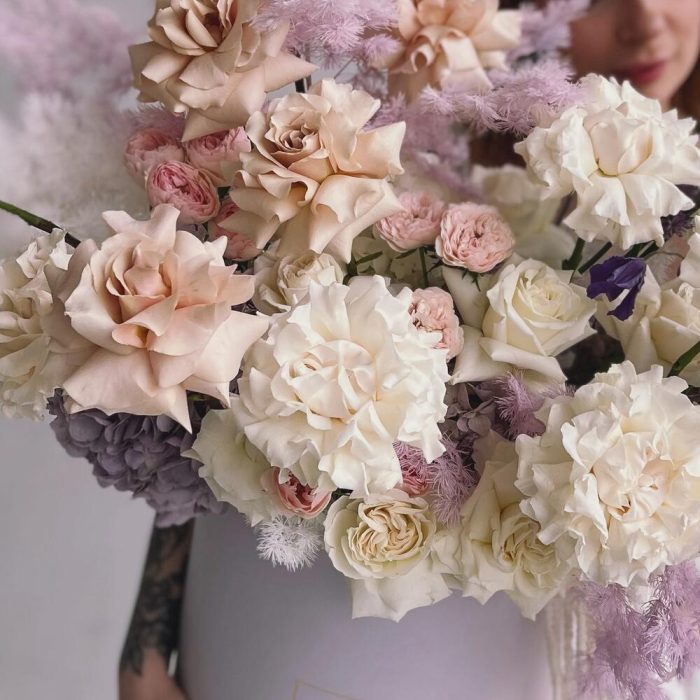Гортензия – 3 шт.Кустовая роза – 7 шт.Аспарагус – 3 шт.Шляпная коробка – 1 шт.Французская роза – 19 шт.