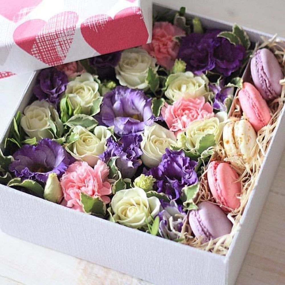 Подарочный набор для сладкоежек с живыми цветами и макарони.Цветы могут отличаться от фото в связи с сезонностью, при этом цветовая гамма остаётся прежней.