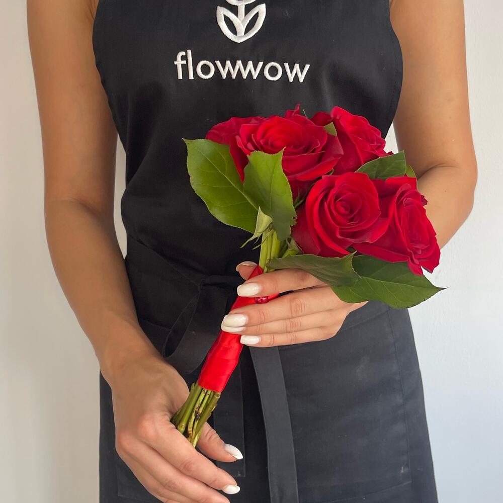 Роза красная – 7 шт.Салал – 5 шт.Лента атласная – 2 шт.Булавка – 1 шт.
