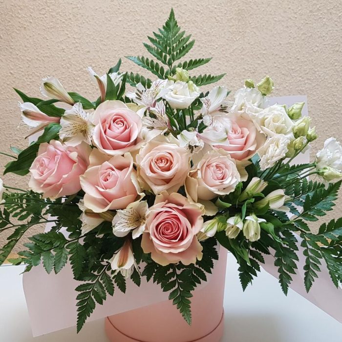 Роза Эквадор – 7 шт.Альстромерия – 4 шт.Листья папоротника – 3 шт.Коробка шляпная – 1 шт.бумага дизайнерская – 1 шт.