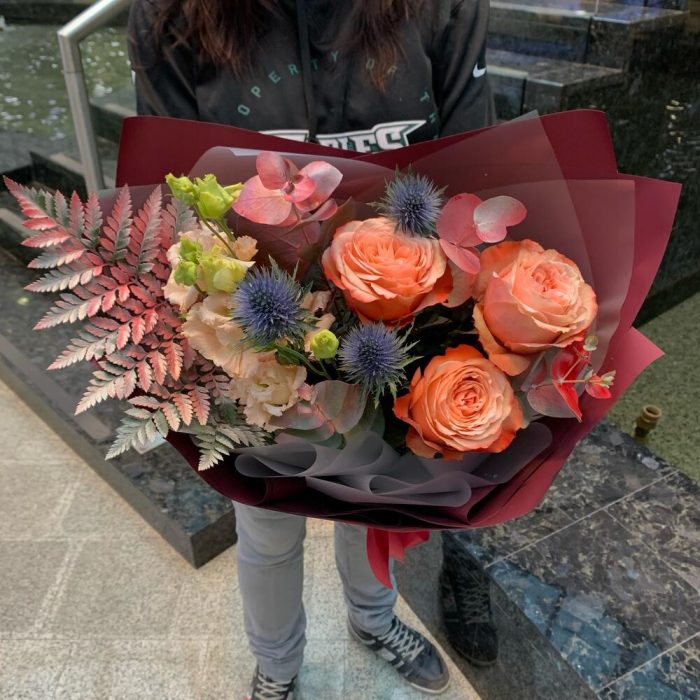 кахала роза пионовидная – 3 шт.Эрингиум синий – 1 шт.эустома персиковая – 1 шт.Эвкалипт – 1 шт.