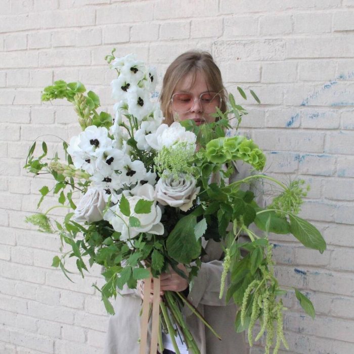 дельфиниумом – 3 шт.Амарант – 1 шт.ирландский колокольчик – 2 шт.Ветки малины – 4 шт.Тубероза – 2 шт.Роза Мента – 2 шт.Пион – 3 шт.Амми – 3 шт.Фисташка – 3 шт.Лента атласная – 1 шт.