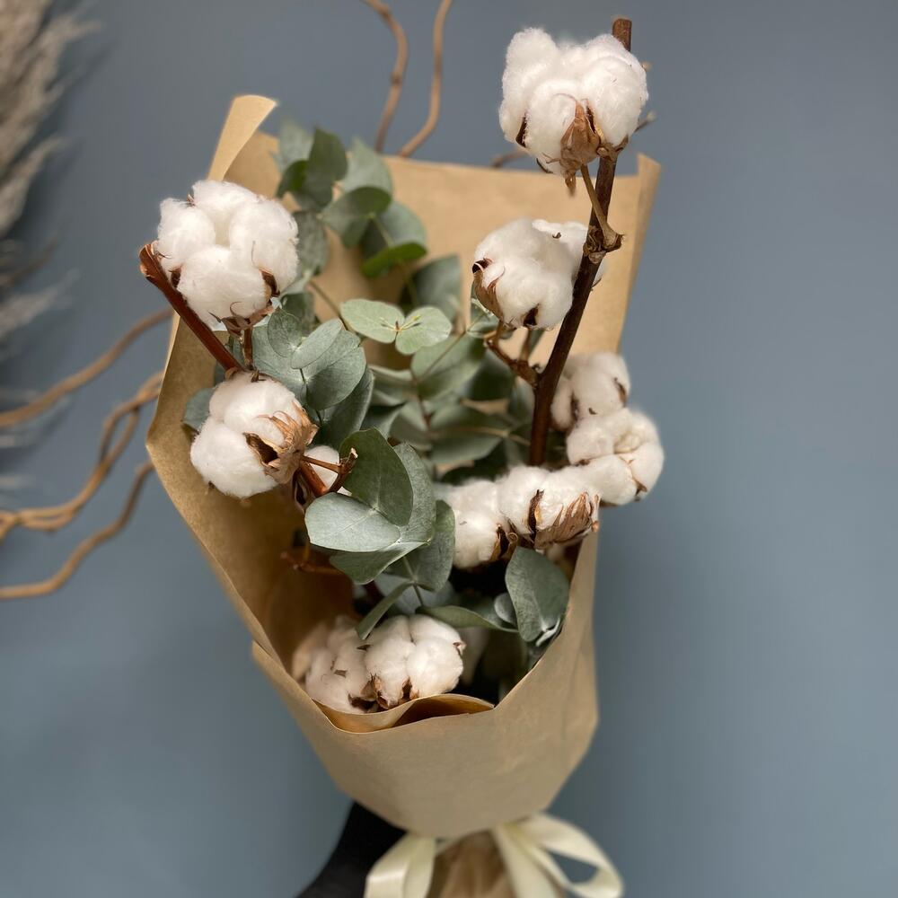 Хлопок (сухоцвет) – 2 шт.Эвкалипт – 4 шт.Упаковка дизайнерская – 1 шт.