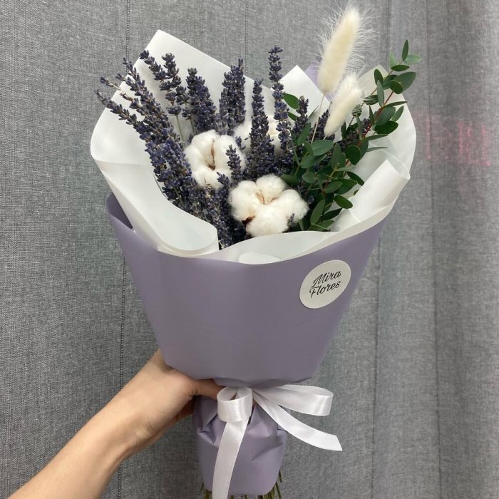 Хлопок натуральный – 3 шт.Лаванда – 1 шт.Эвкалипт – 3 шт.Упаковка дизайнерская – 1 шт.Лагурус (сухоцвет) – 3 шт.