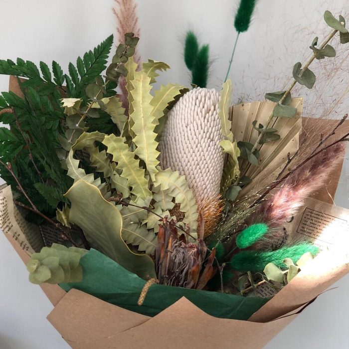 Банксия – 1 шт.Лагурус – 8 шт.Папоротник – 1 шт.пампас – 2 шт.Пальма – 1 шт.Эвкалипт – 1 шт.березовые ветки – 1 шт.михла грас – 1 шт.Упаковка дизайнерская – 1 шт.
