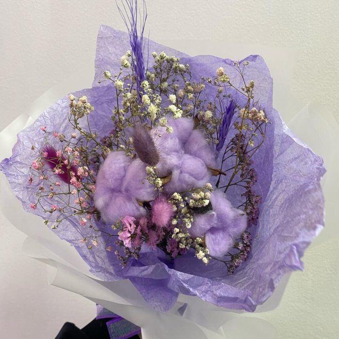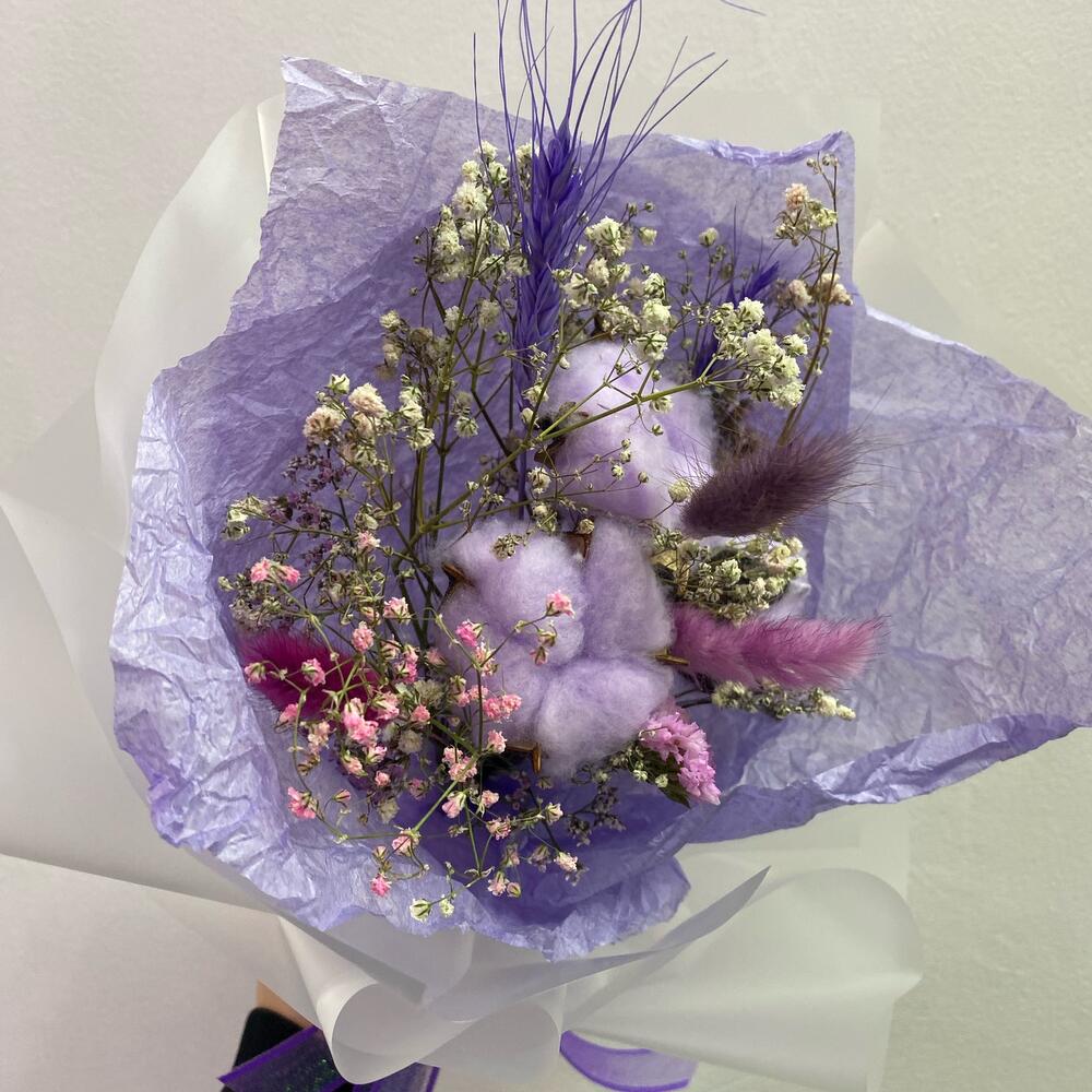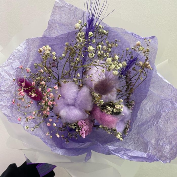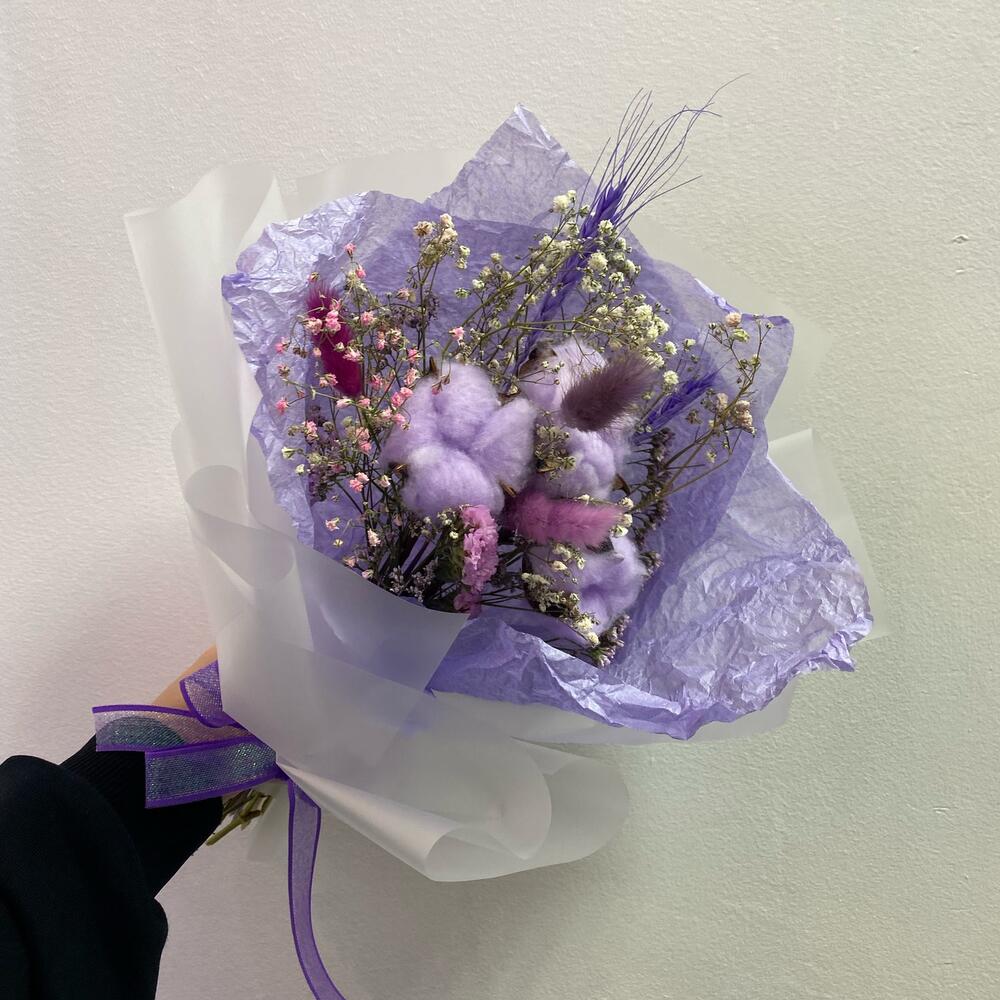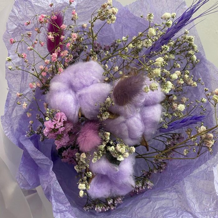 Гипсофила – 1 шт.Лимониум – 1 шт.Хлопок – 3 шт.Колоски пшеницы – 2 шт.Лагурус – 3 шт.Авторская упаковка – 1 шт.открытка с вашими пожеланиями – 1 шт.