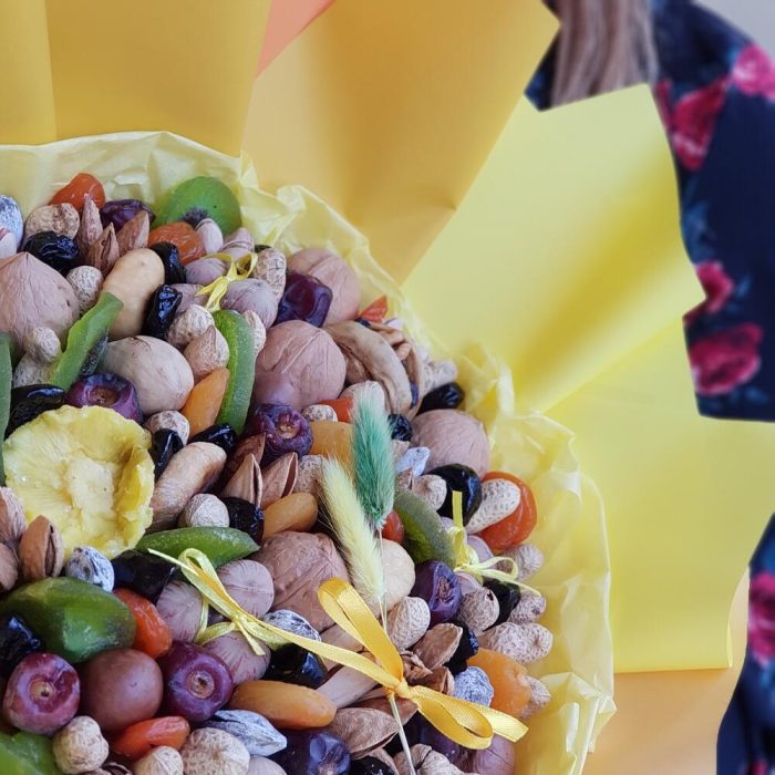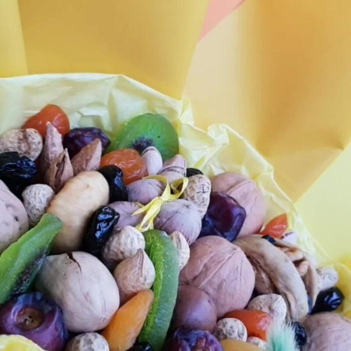 Орехи грецкие – 100 гр.орехи пекан – 30 гр.Орехи фундук – 25 гр.Фисташки – 15 гр.орехи миндаль – 30 гр.орехи макадамия – 20 гр.абрикос соленый косточка – 13 гр.арахис в скорлупе – 50 гр.ананас вяленый – 15 гр.Финики – 100 гр.Курага – 100 гр.Дыня – 40 гр.Чернослив – 50 гр.Инжир – 35 гр.Киви – 70 гр.Лагурус – 2 шт.коробка транспортировочная – 1 шт.