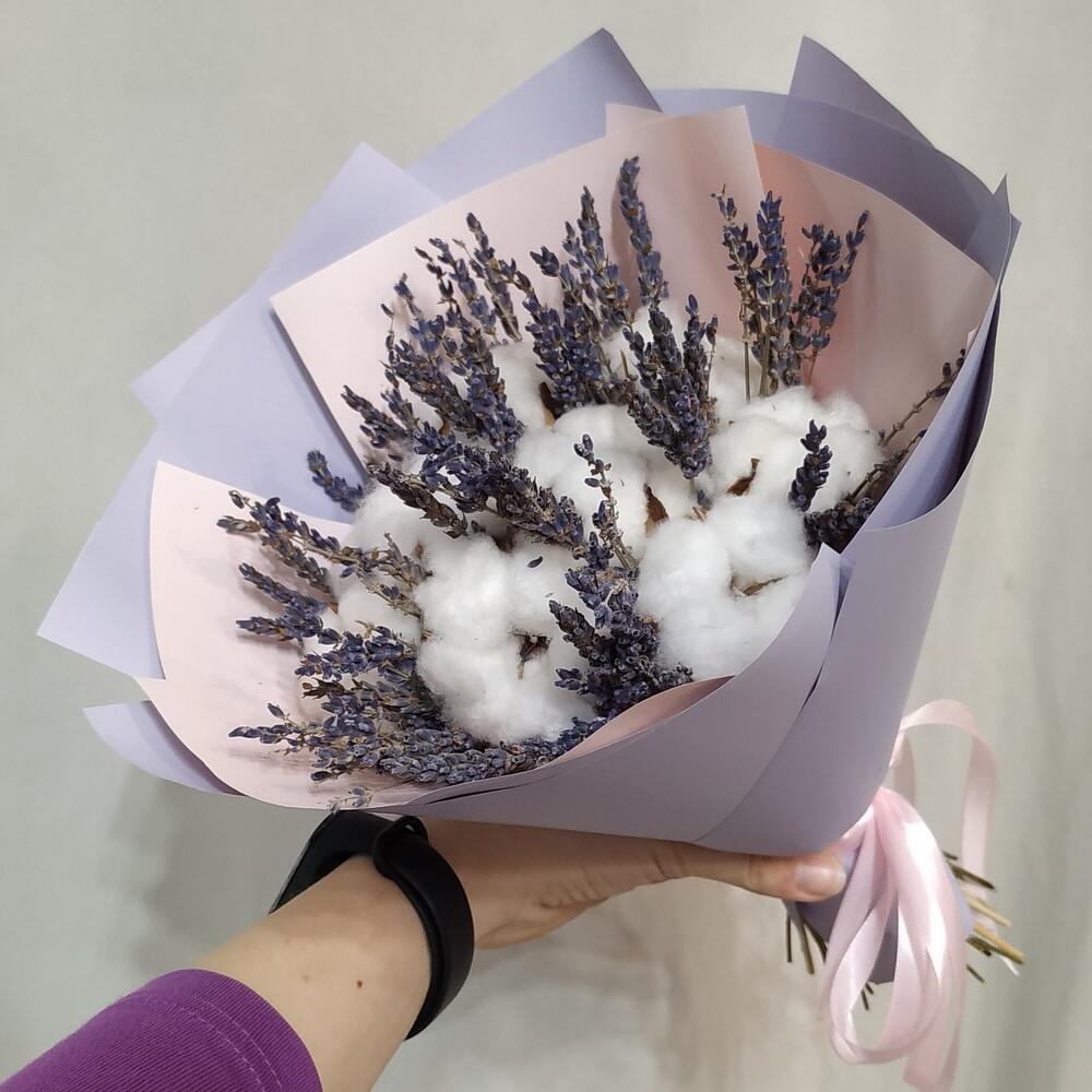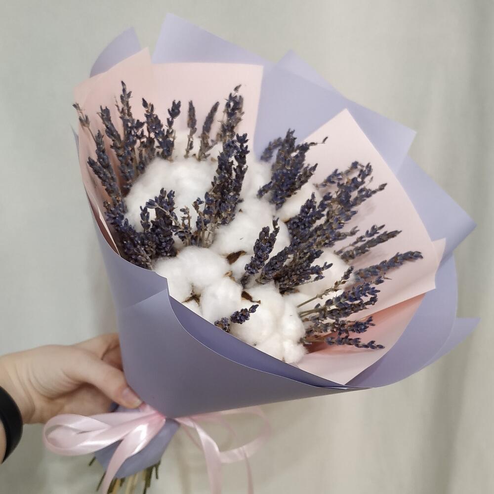 Невесомый букет из натурального хлопка и ароматной лаванды станет нежным украшением на долгое время.