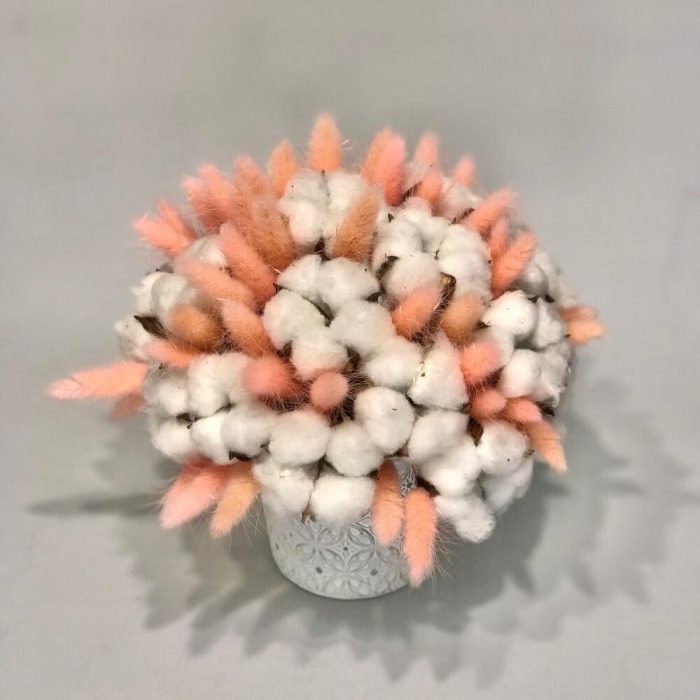 Хлопок ветка – 5 шт.Лагурус (сухоцвет) – 40 шт.Кашпо – 1 шт.
