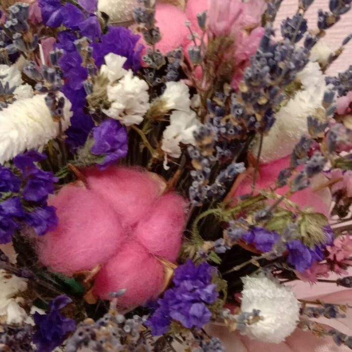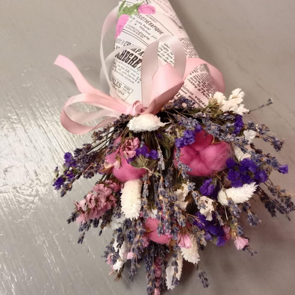 Лаванда (сухоцвет) – 15 шт.Статица – 2 шт.Хлопок – 3 шт.Конус упаковка – 1 шт.Колосья – 7 шт.