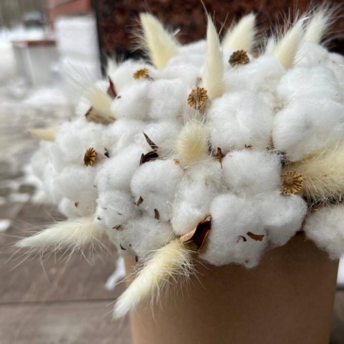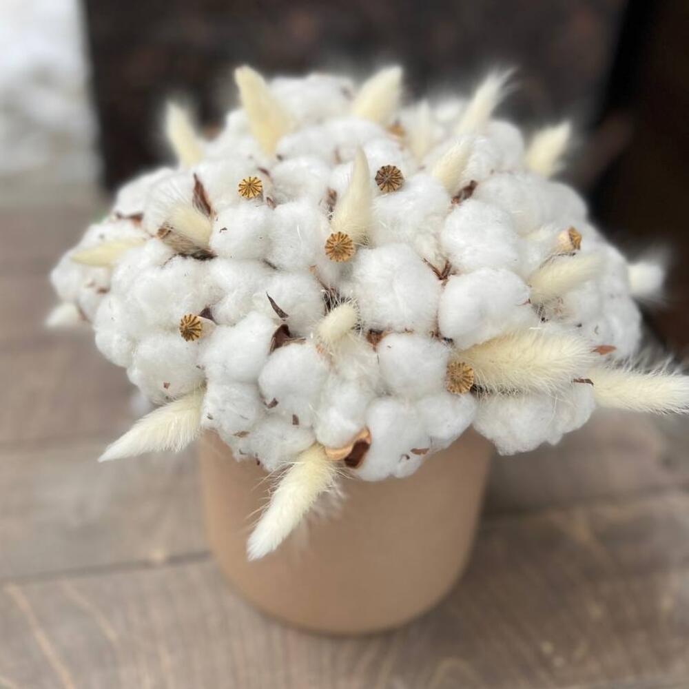 Хлопок натуральный – 25 шт.Лагурус (сухоцвет) – 15 шт.мак коробочка – 10 шт.Шляпная коробка – 1 шт.Оазис флористический – 1 шт.