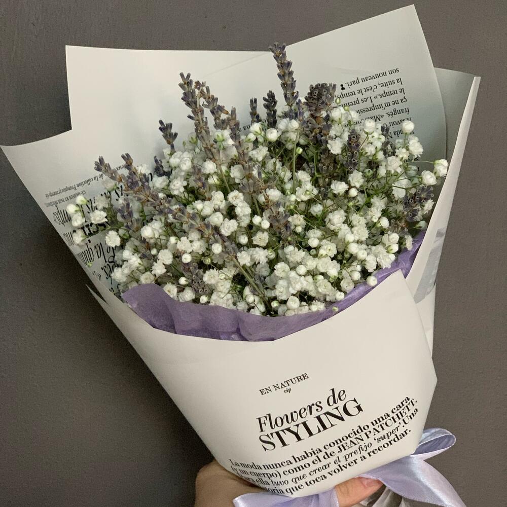 Гипсофила – 15 шт.Лаванда – 36 шт.Дизайнерская упаковка – 1 шт.