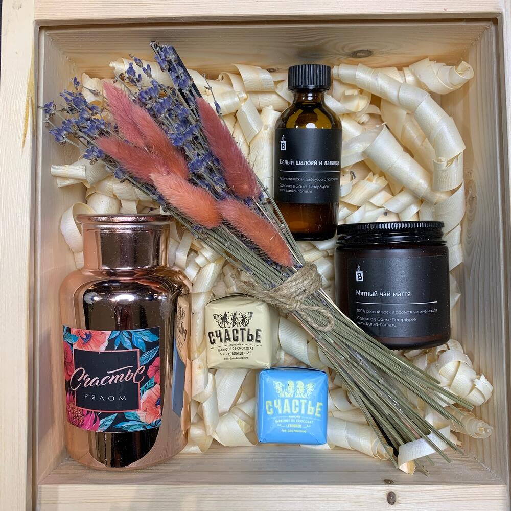 Ящик деревянный – 1 шт.Ваза стекло – 1 шт.букет сухоцветов из лагуруса и лаванды – 1 шт.свеча banca home в ассортименте – 1 шт.диффузор banka home в ассортименте – 1 шт.конфеты счастье 50г – 2 шт.