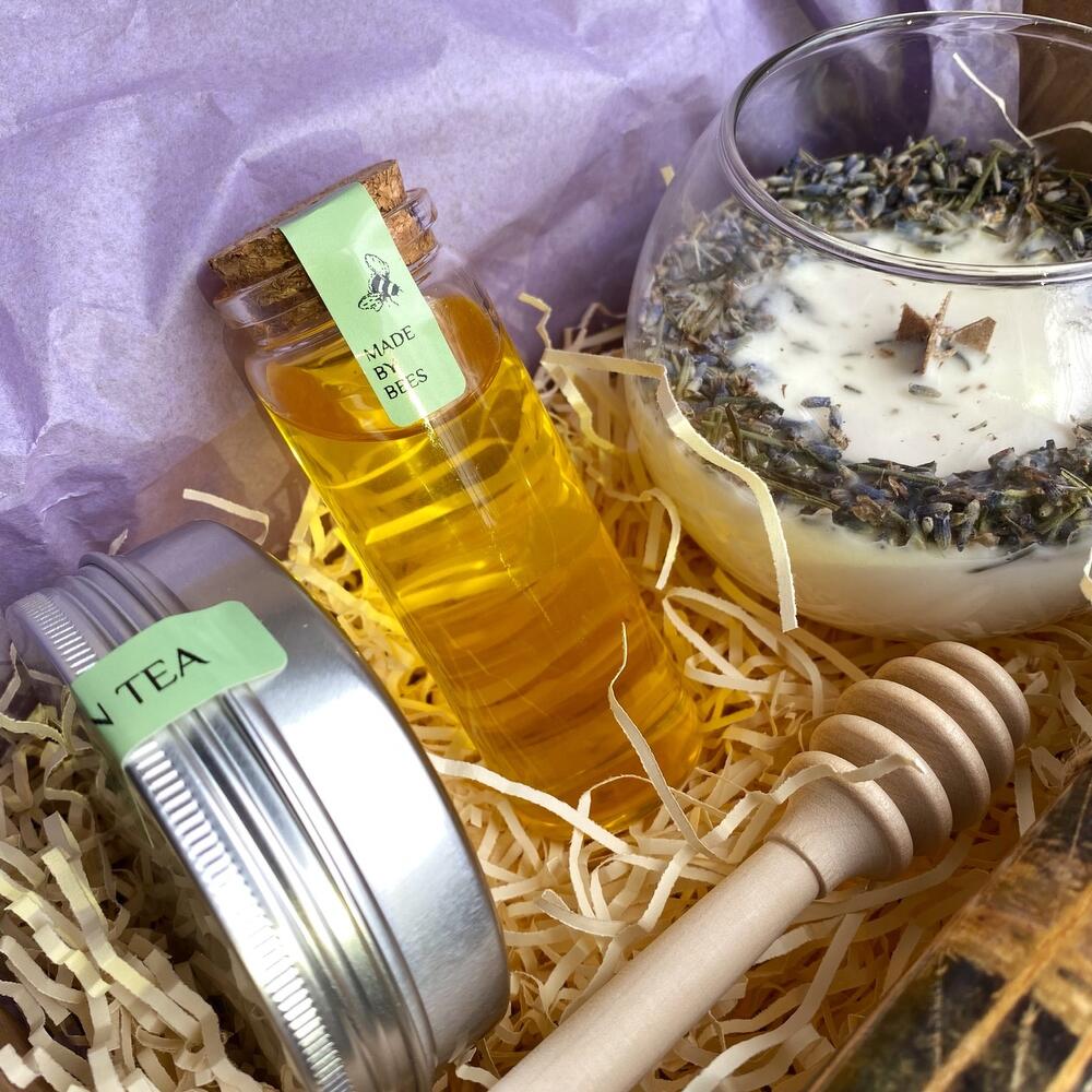 Подарочная коробка – 1 шт.мед липовый – 100 гр.веретено деревянное для меда – 1 шт.зеленый чай китайский – 100 млсвеча в террариуме с сухоцветами лаванды – 1 шт.