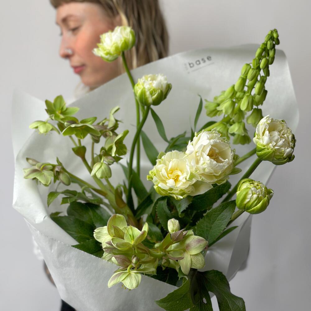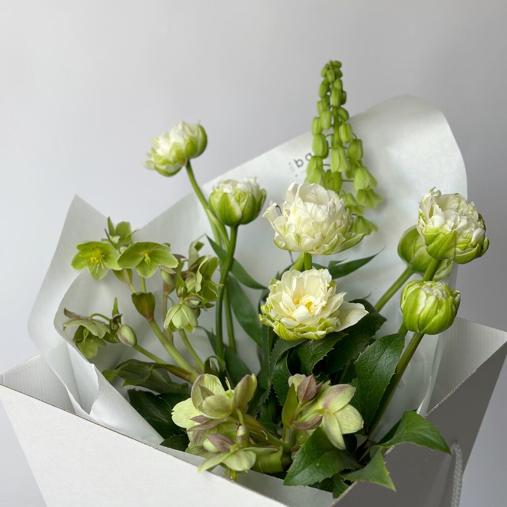 Небольшой зеленый букет из сезонных цветов