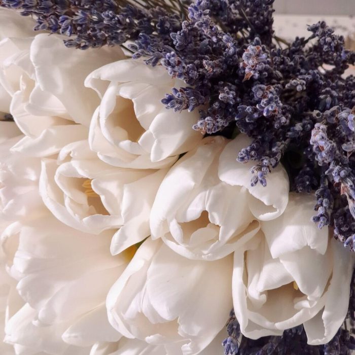 Лаванда (сухоцвет) – 150 гр.Лента органза – 1 шт.Открыточка с вашими пожеланиями – 1 шт.Шпагат джутовый – 1 шт.тюльпаны белые голландия – 15 шт.любовь флориста (бесплатно) – 1 шт.