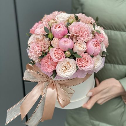 Шляпная коробка с розами, гвоздикой, гипсофилой и антуриумом “Kenzo box”